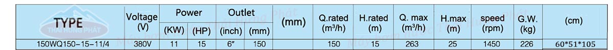 Bảng thông số kỹ thuật Máy bơm nước thải Stella 150WQ150-15-11/4 11kW