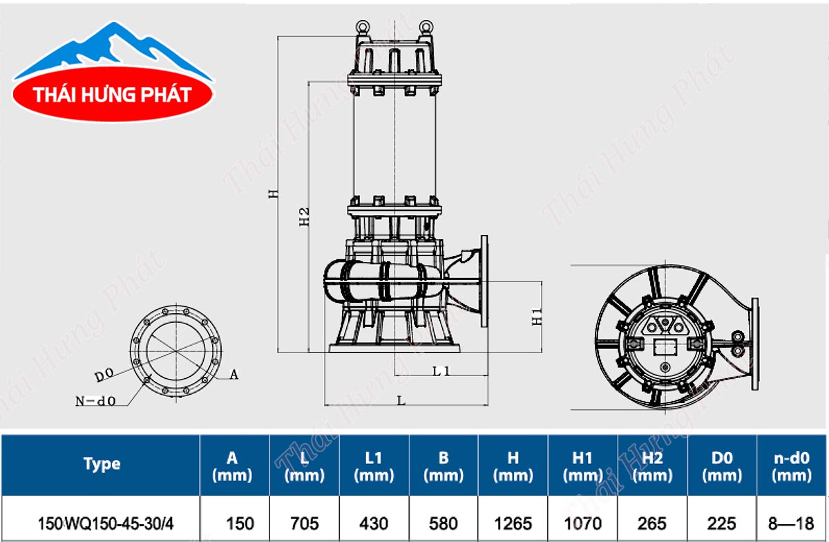 Bảng thông số kích thước Máy bơm nước thải Stella 150WQ150-45-30H/4 30kW