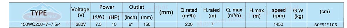 Bảng mô tả chi tiết Máy bơm chìm nước thải Stella 150WQ200-7-7.5/4 7.5kW